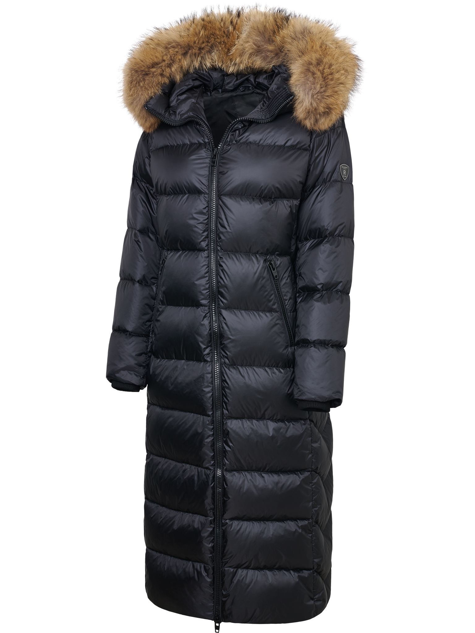 Ekstra luksus dunfrakke i ekstra længde - Hele 122 cm lang. Frakken har mange flotte detaljer, såsom to inderlommer, en kraftig dobbelt lynlås (Har du problemer med lynlåsen, se guiden herog 4 trykknapper i siderne. Længden er 122 cm, som går under knæerne og nemt kan dække en lang kjole. Selvom frakken er meget lang, så vejer den kun ca. 1,5 kg.