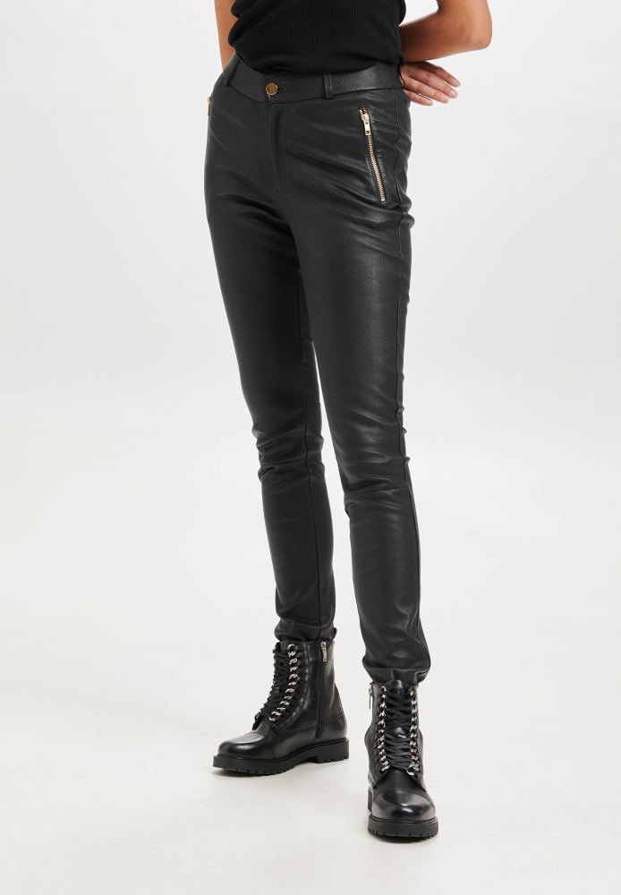 Eksklusive skindbukser / skindleggins i blødt og smidigt stretch-lammeskind, der sikrer en komfortabel pasform og flot facon hele dagen. Materialet indeholder lycra, som hjælper bukserne med at bevare formen og tilpasse sig kroppens bevægelser. Lamme-skindet er et bi-produkt fra fødevareindustrien, er biologisk nedbrydeligt og et mere ansvarligt valg med fokus på bæredygtighed. Samtidig har materialet naturlig åndbarhed, som øger komforten.