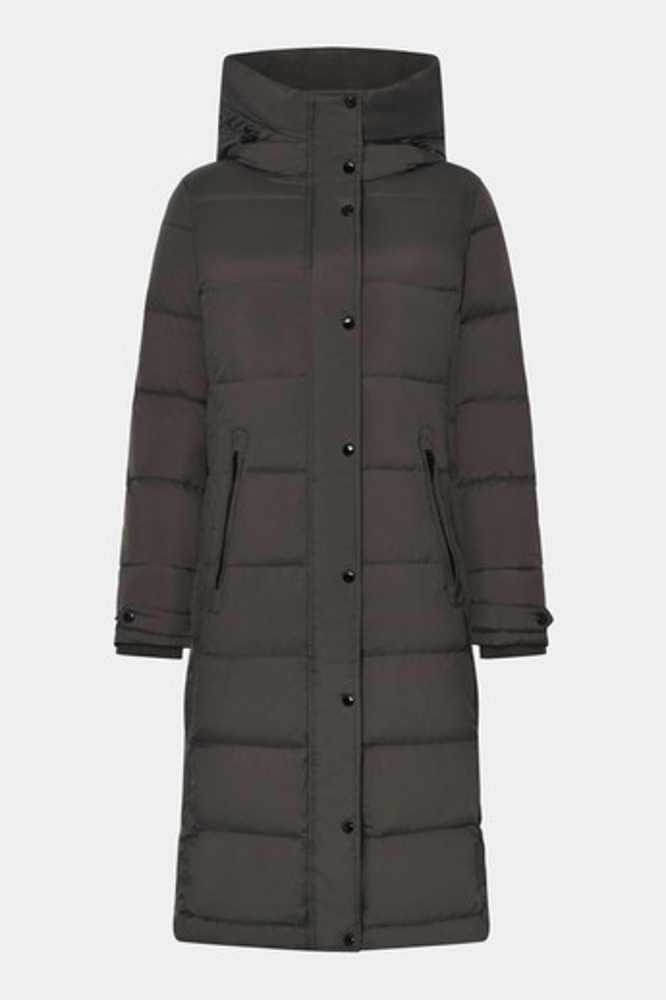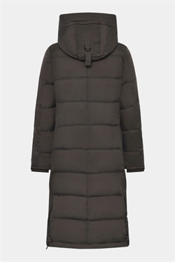 Let figursyet dunfrakke fra Rockandblue. Frakken har mange flotte detaljer, såsom to inderlommer, en kraftig dobbelt lynlås (Har du problemer med lynlåsen, se guiden her), vindfang i ærmerne og lang lynlås i siderne, for mere bevægelsesfrihed. Længden er 110 cm, som går under knæerne og nemt kan dække en nederdel. Selvom frakken er lang, så vejer den kun ca. 1,2 kg.