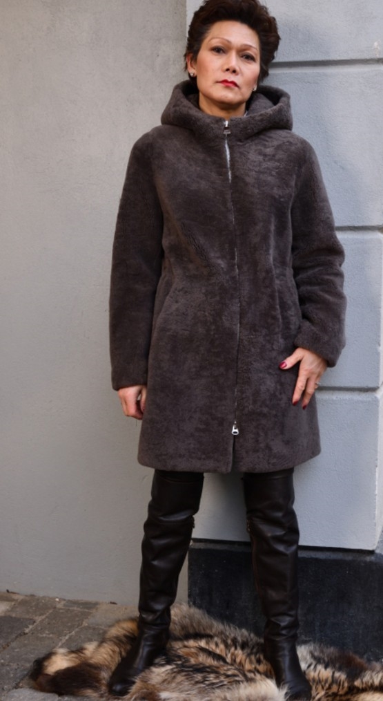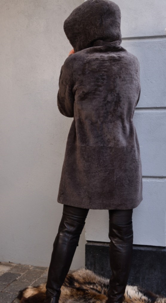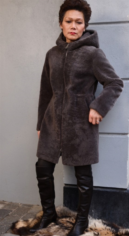 Sporty Curly Rulam. Rulamspelsen er vendt ud af, kaldes inside-Out.. Jakken har en tovejs lynlås, som kan lynes nedfra også. Hætten er praktisk mod vind og  vejr.