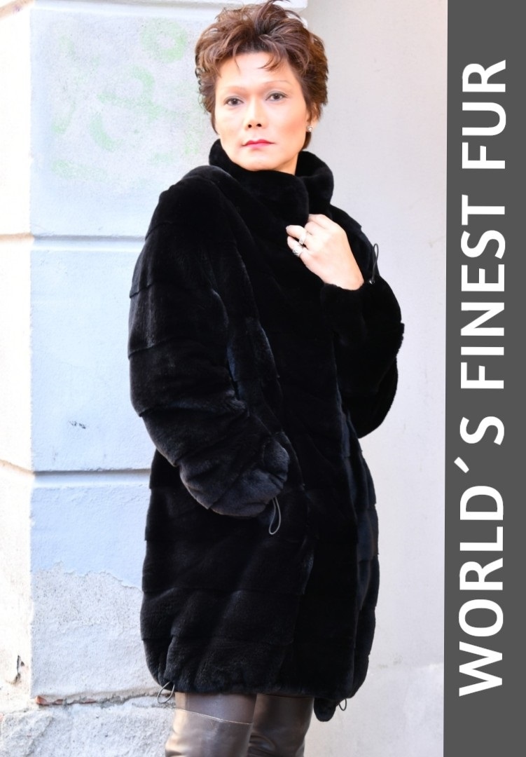 Jakken er fremstillet med en moderne pelsteknik, hvor pelsen er lagt vandret i halve skind. Denne teknik skaber et smukt farvespil i overfladen og tilfører et let sporty udtryk, samtidig med at det elegante helhedsindtryk bevares.