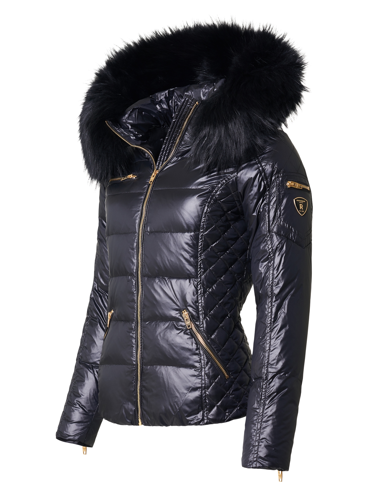 Eksklusiv dunjakke med en ægte pelskrave i vaskebjørn fra Rockandblue, som sidder perfekt. Rita modellen har en længde på 63 cm, er sporty og kan bruges som både vinter- og overgangsjakke. De smukke guld detaljer giver jakken et elegant og feminint look.