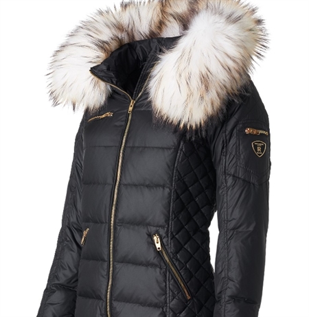 Eksklusiv dunjakke med en ægte pelskrave i vaskebjørn fra Rockandblue, som sidder perfekt. Rita modellen har en længde på 63 cm, er sporty og kan bruges som både vinter- og overgangsjakke. De smukke guld detaljer giver jakken et elegant og feminint look.