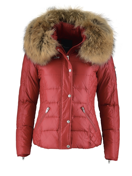Sporty Dunjakke med en ægte pelskrave i vaskebjørn / Raccoon Fur fra Rockandblue, som sidder perfekt. Zora modellen har en længde på 63 cm, er sporty og kan bruges som både vinter- og overgangsjakke. Den sølvfarvede lynlås og det figursyede design giver jakken et elegant og feminint look.